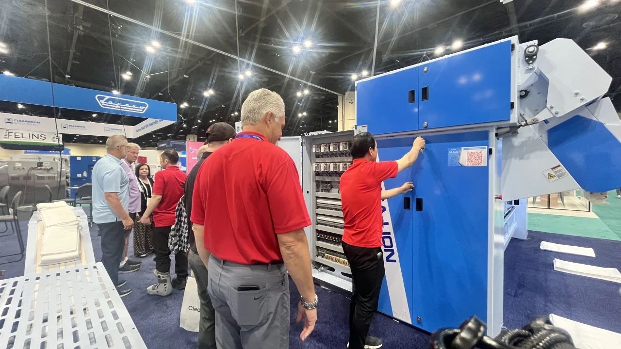 “Titanium”鈦系列洗脫機與烘干機,聚焦高效洗滌與節(jié)能降耗雙重優(yōu)勢。通過精準(zhǔn)控溫、智能水循環(huán)系統(tǒng)及變頻電機技術(shù),實現(xiàn)單位時間內(nèi)更高洗滌量和烘干量的同時,大幅降低水、電、蒸汽消耗,為用戶帶來經(jīng)濟與環(huán)保兼具的卓越體驗 參展人士對這一系列設(shè)備表現(xiàn)出了濃厚興趣,在現(xiàn)場海獅人員的詳細操作講解下,他們對中國制造的研發(fā)制造實力有了更深刻的認識,紛紛為海獅機械的創(chuàng)新能力點贊。