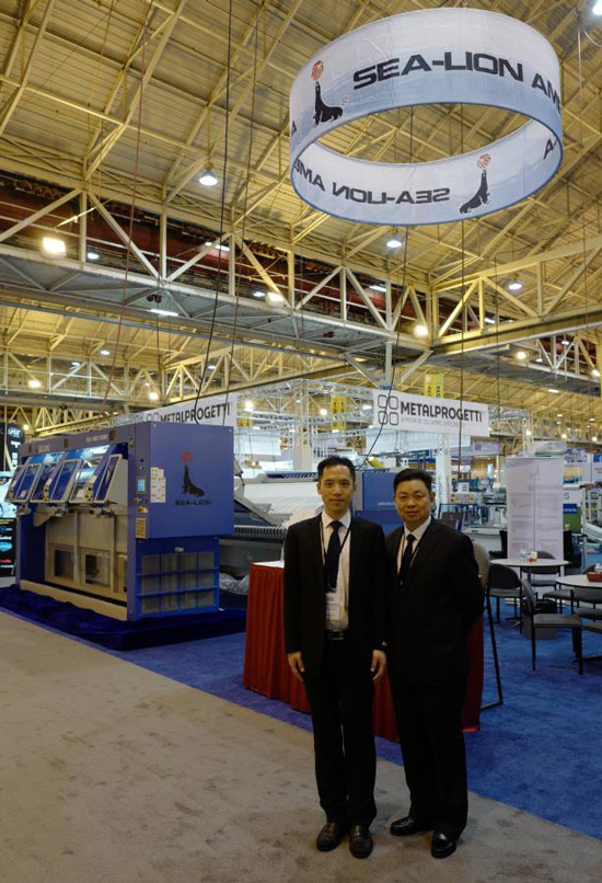當(dāng)日,江蘇海獅機(jī)械股份有限公司由公司總經(jīng)理鄔士新、公司常務(wù)副總經(jīng)理張建豐帶隊(duì),展出了XGQ-100CFQ全自動(dòng)洗脫機(jī)、ZD3300-VB高速折疊機(jī)、ZBQ3300-III三工位展布機(jī)。