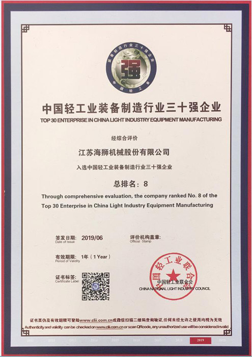 In order to accelerate the strong country construction and promote the development of the light industrial equipment manufacturing industry ,in the principle of preciseness, fairness and science ,the China light industry federation has organized the evaluation of “top 30 enterprises in Chinese light industrial equipment manufacturing industry” and “top 100 enterprises in Chinese light industrial technology industry” in 2018 .